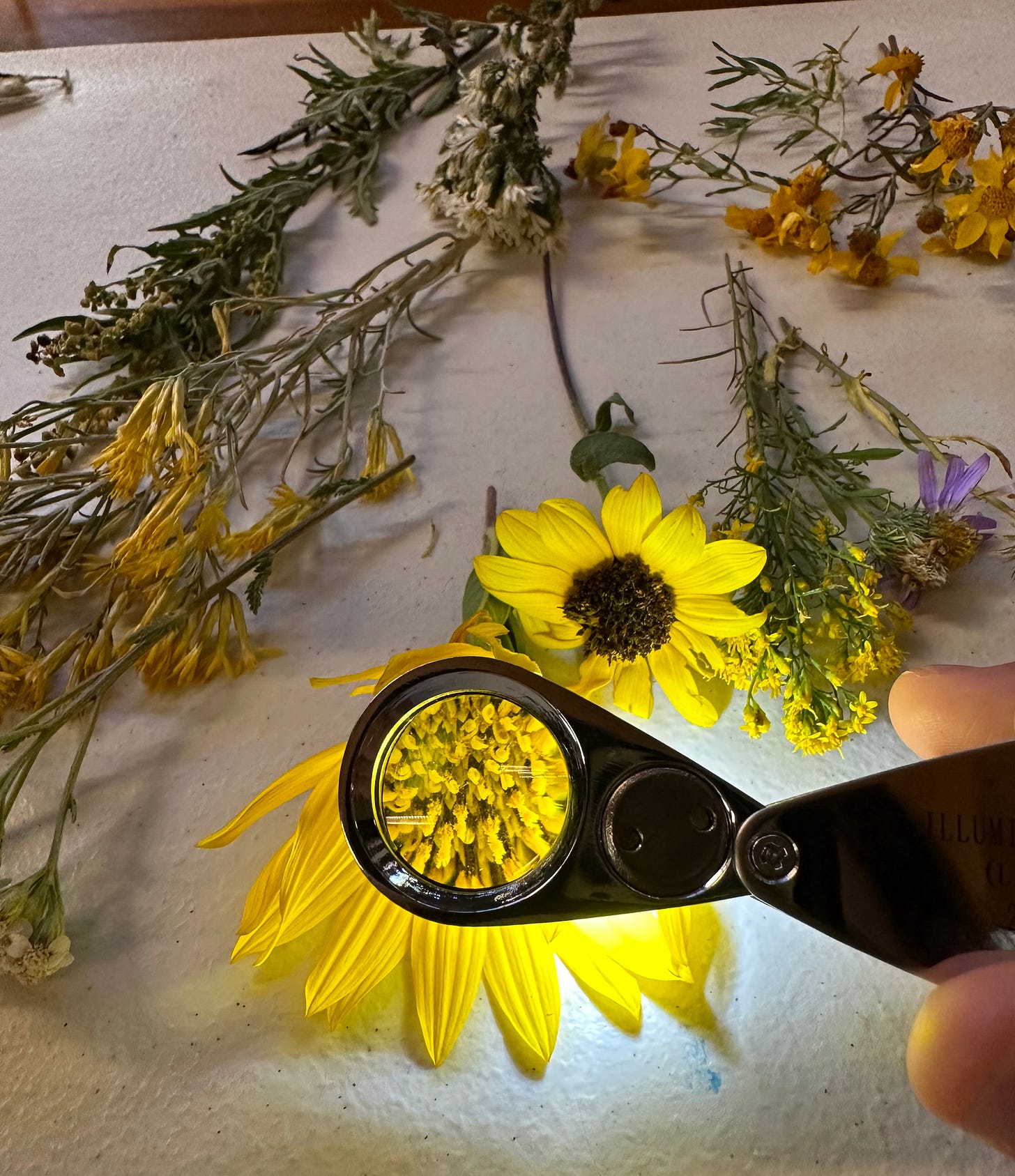 As much as I enjoy critiquing science and our societal obsession with it, I was reminded of its grounding value during a botany workshop I attended on Saturday, about the Asteraceae plant family. This largest family of flowering plants was once known as the Composites because every flower in it is actually a composite of many tiny flowers. The sunflower is the classic example of an Aster – its large brown center is actually hundreds of individual flowers called disc flowers, complete with its own set of male and female reproductive parts. Each of its yellow petals are also individual flowers, called ray flowers – if you pluck one out, you can sometimes make out a tiny bifurcated stigma, the female reproductive part, at the base. Knowing this transforms the way you look at dandelions, daisies, thistles, marigolds, and the countless other common flowers in the Aster family.